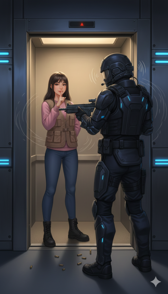 Un guardia de seguridad de élite, armado con un rifle de asalto y protegido con armadura táctica completa, estaba plantado justo frente al ascensor. No era un robot; era un hombre entrenado para situaciones de máxima alerta. El cañón del arma apuntaba directamente al pecho de Liliana.